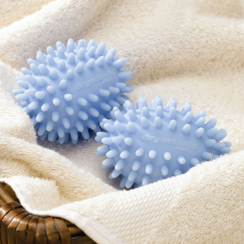 Dryer balls are nubby rubber balls that you toss into the dryer with your wet clothes. As the garments spin, dryer balls pummel the fabrics into soft submission, so the items dry faster and fluffier, saving wear and tear on the machine as well as on your threads. I find them to be particularly effective on towels, which are also more absorbent if they are not washed or dried with softener. You use less energy and actually get better results. I have seen them in a wide variety of stores for about $10. My grandma told me years ago I should dry things like comforters and down jackets with clean tennis balls, so I just want to kick myself for not thinking of inventing these first.
